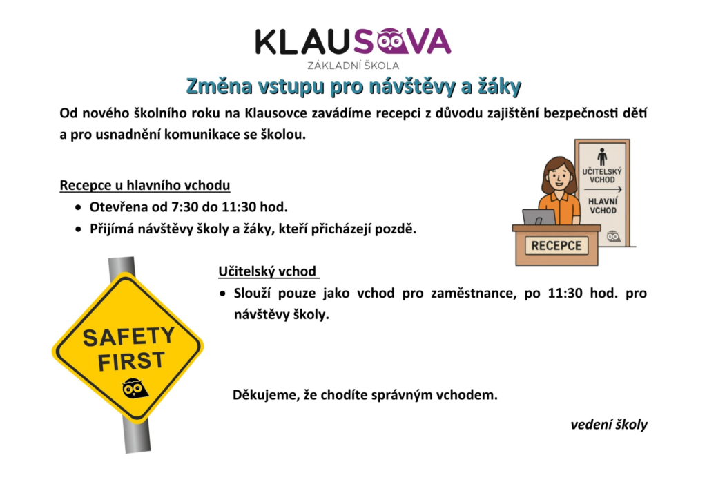 Od nového školního roku na Klausovce zavádíme recepci z důvodu zajištění bezpečnosti dětí a pro usnadnění komunikace se školou. Recepce u hlavního vchodu• Otevřena od 7:30 do 11:30 hod.• Přijímá návštěvy školy a žáky, kteří přicházejí pozdě. Učitelský vchod• Slouží pouze jako vchod pro zaměstnance, po 11:30 hod. pro návštěvy školy. Děkujeme, že chodíte správným […]
