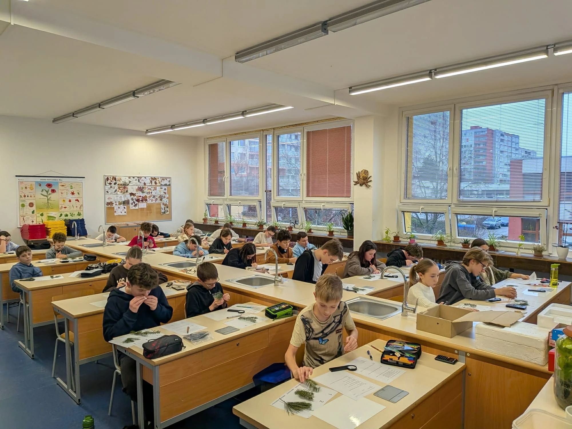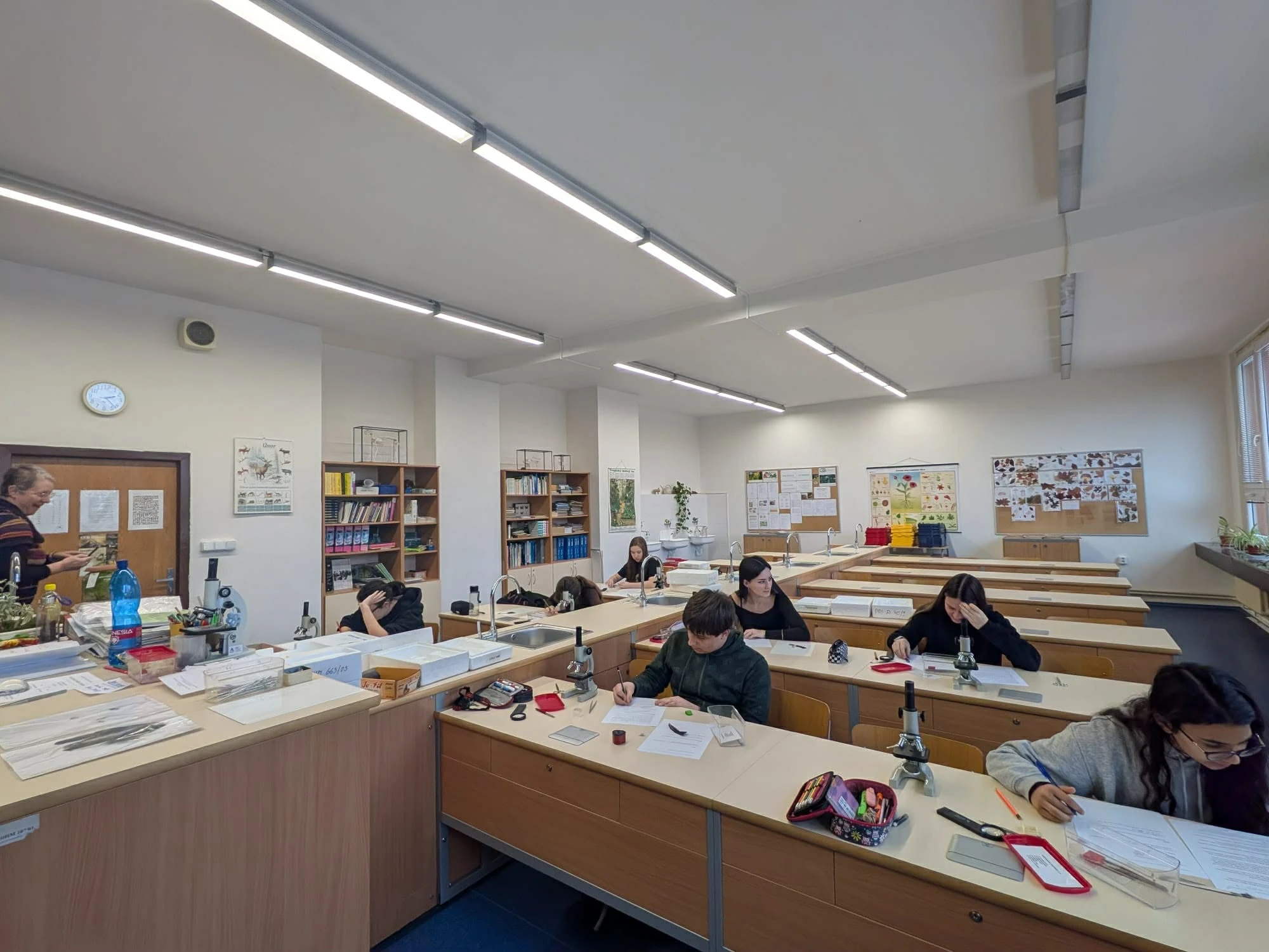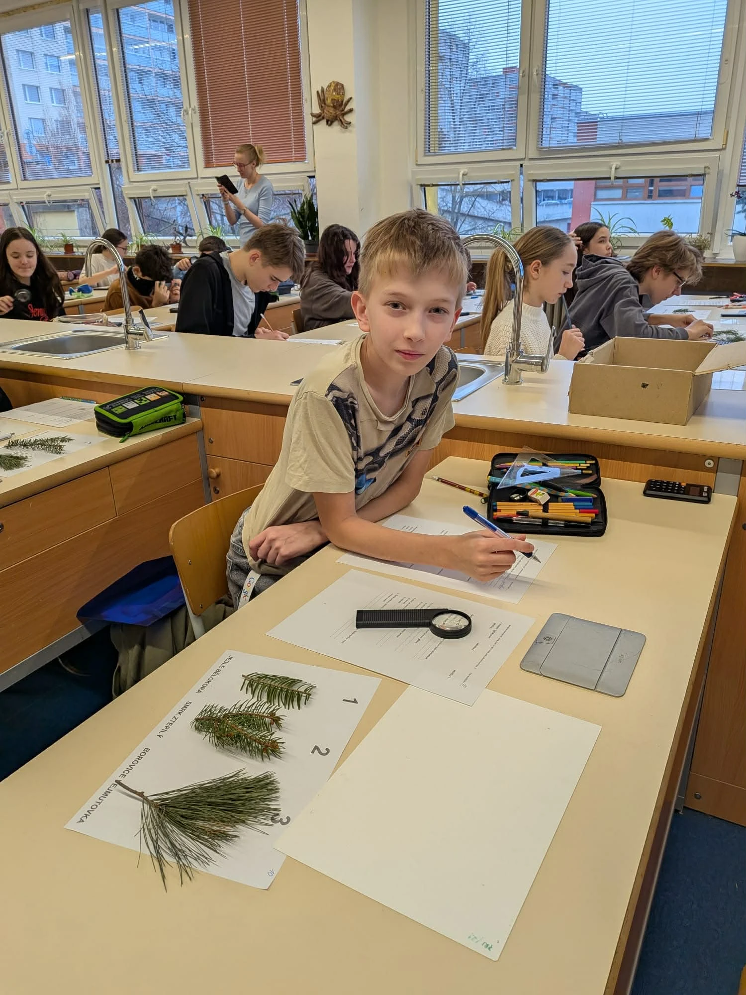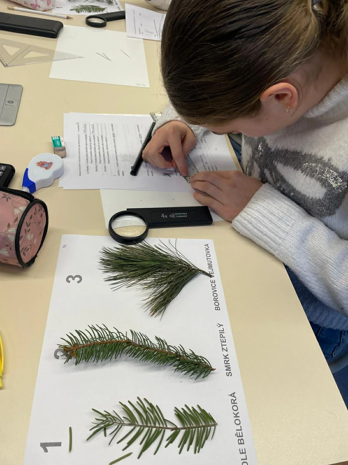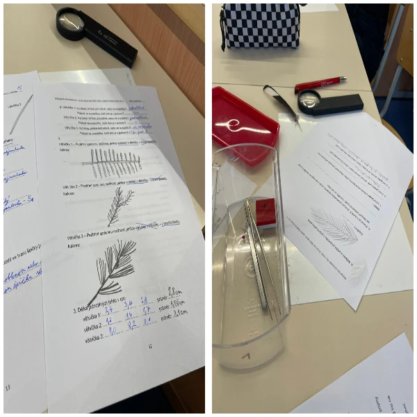 Závěrečnou částí byla laboratorní práce. Soutěžící zkoumali jehličí tří jehličnatých stromů – jedle bělokoré, borovice vejmutovky a smrku ztepilého. Pod mikroskopem pozorovali jejich stavbu, porovnávali rozdíly a počítali průměrnou délku jehlic. Nešlo jen o přesnost, ale i o schopnost pečlivě pracovat a vyvozovat závěry z pozorování.