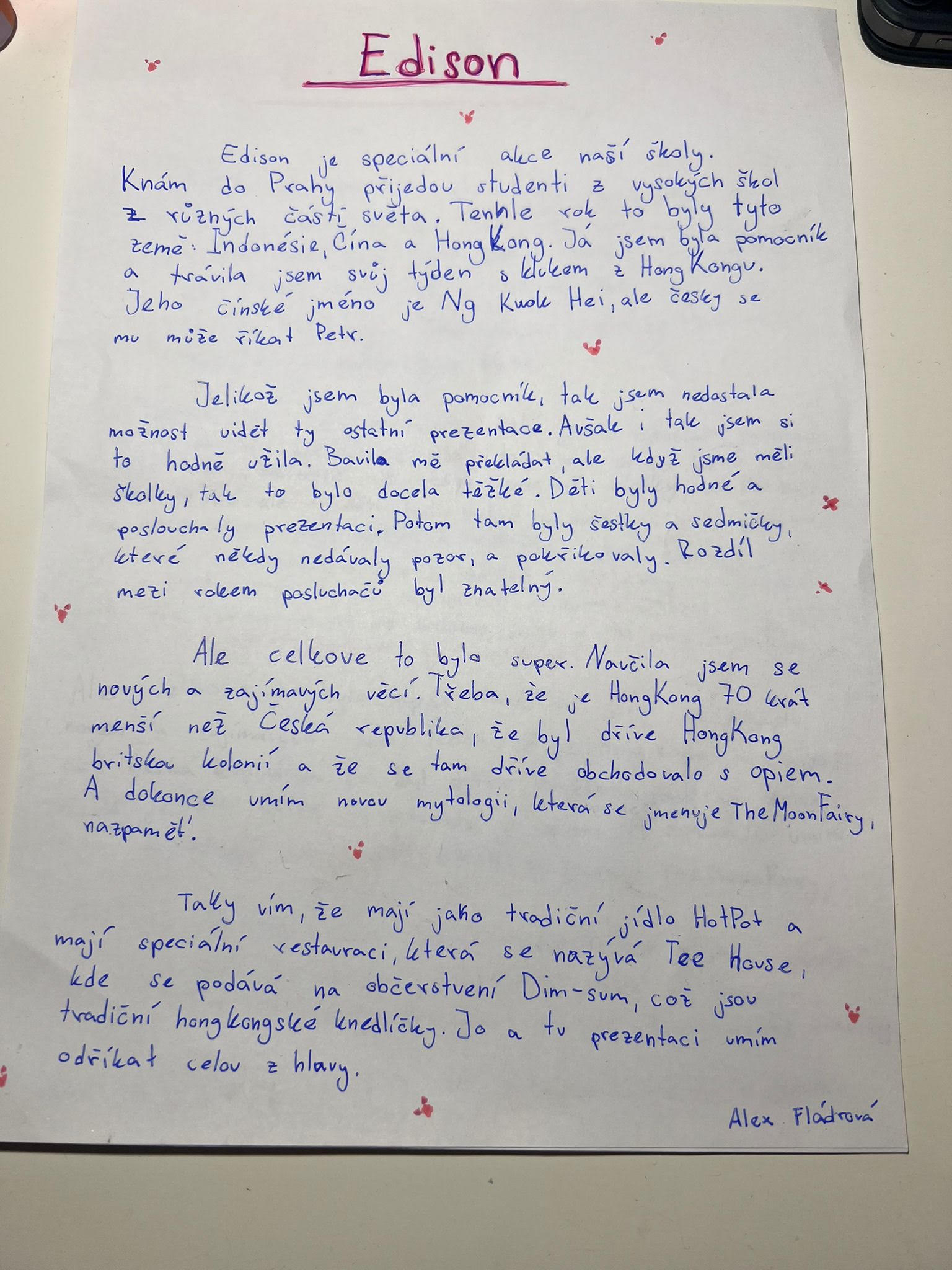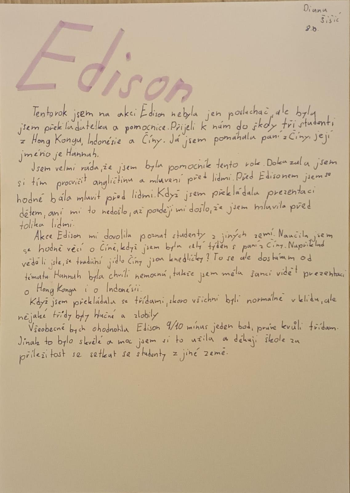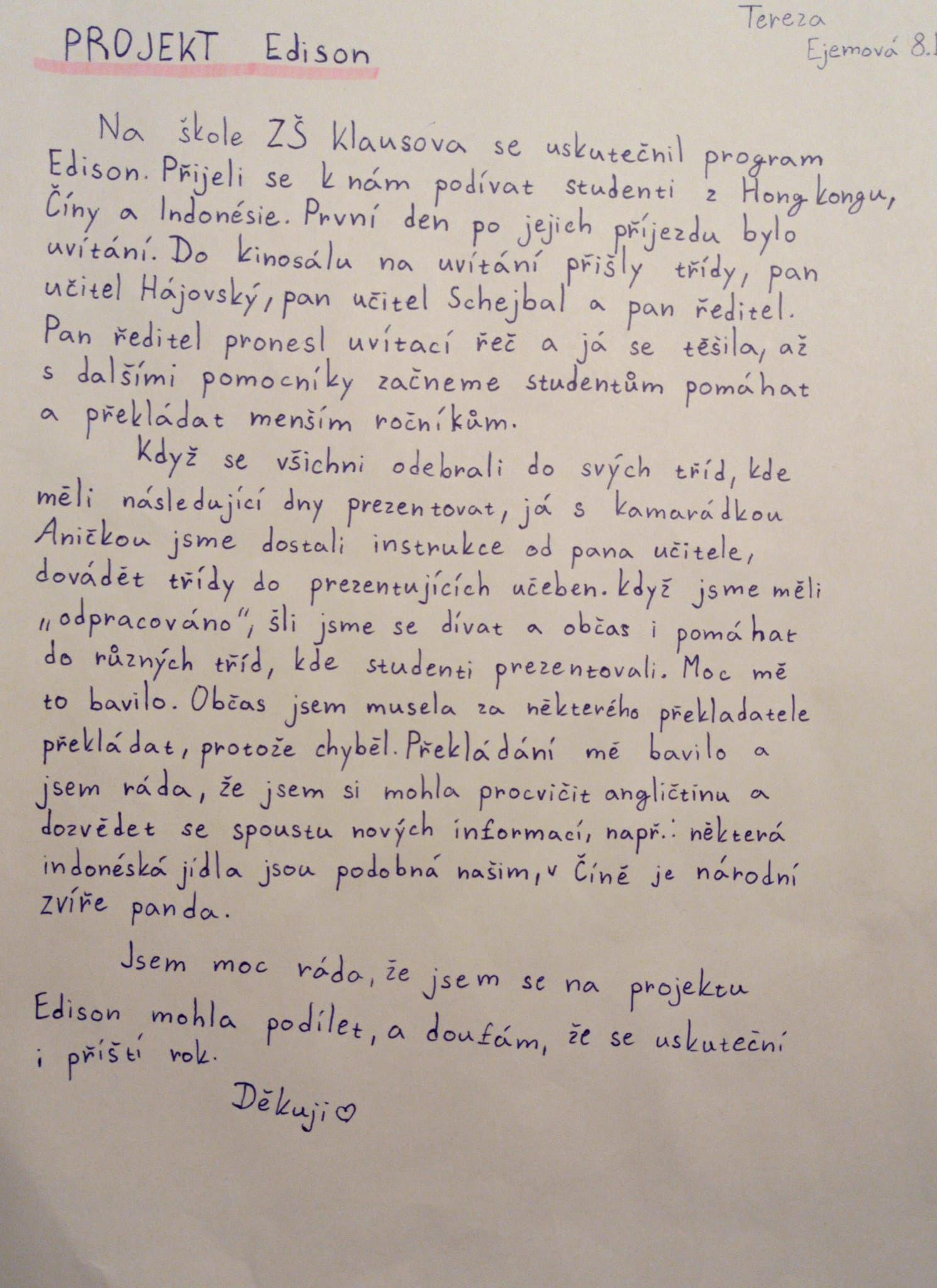 Jak si mezinárodní program užili ti, kteří ho sledovali z lavic – a někdy i z role pomocníků či překladatelů? Osmáci se k celé zkušenosti vrátili v hodinách českého jazyka. Dostali příležitost zastavit se, promyslet si, co jim setkání se studenty z různých koutů světa přineslo, a převést své zážitky do souvislého sdělení.