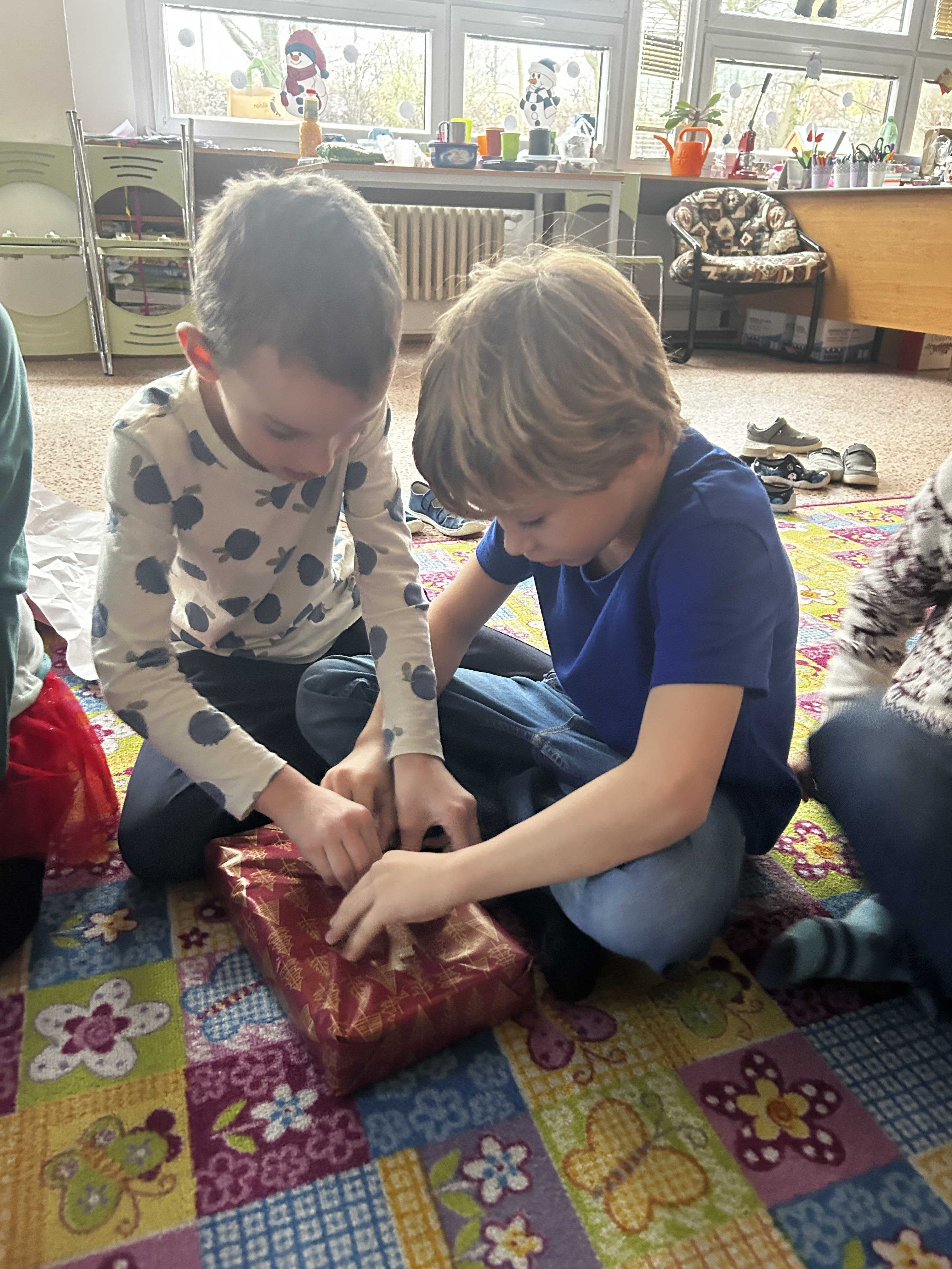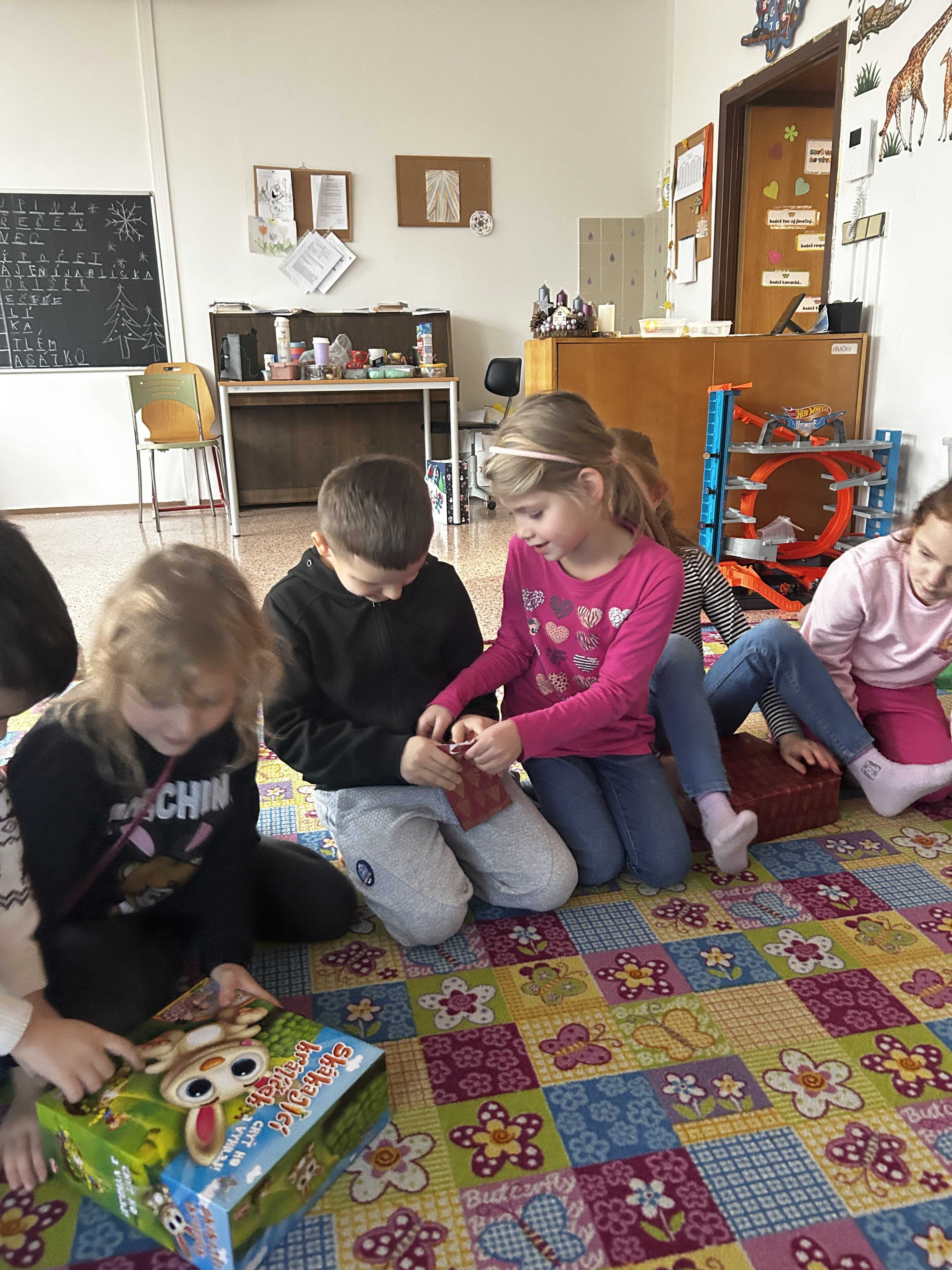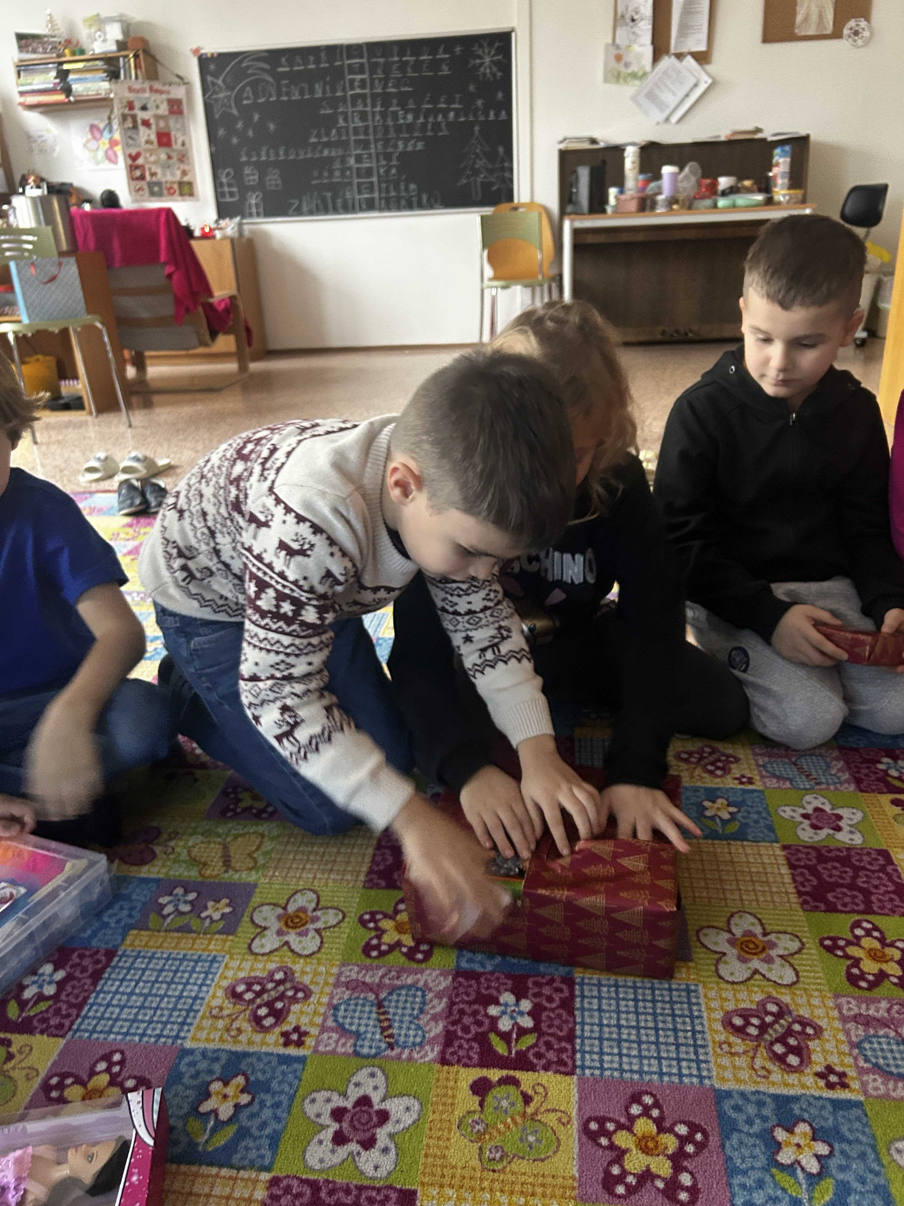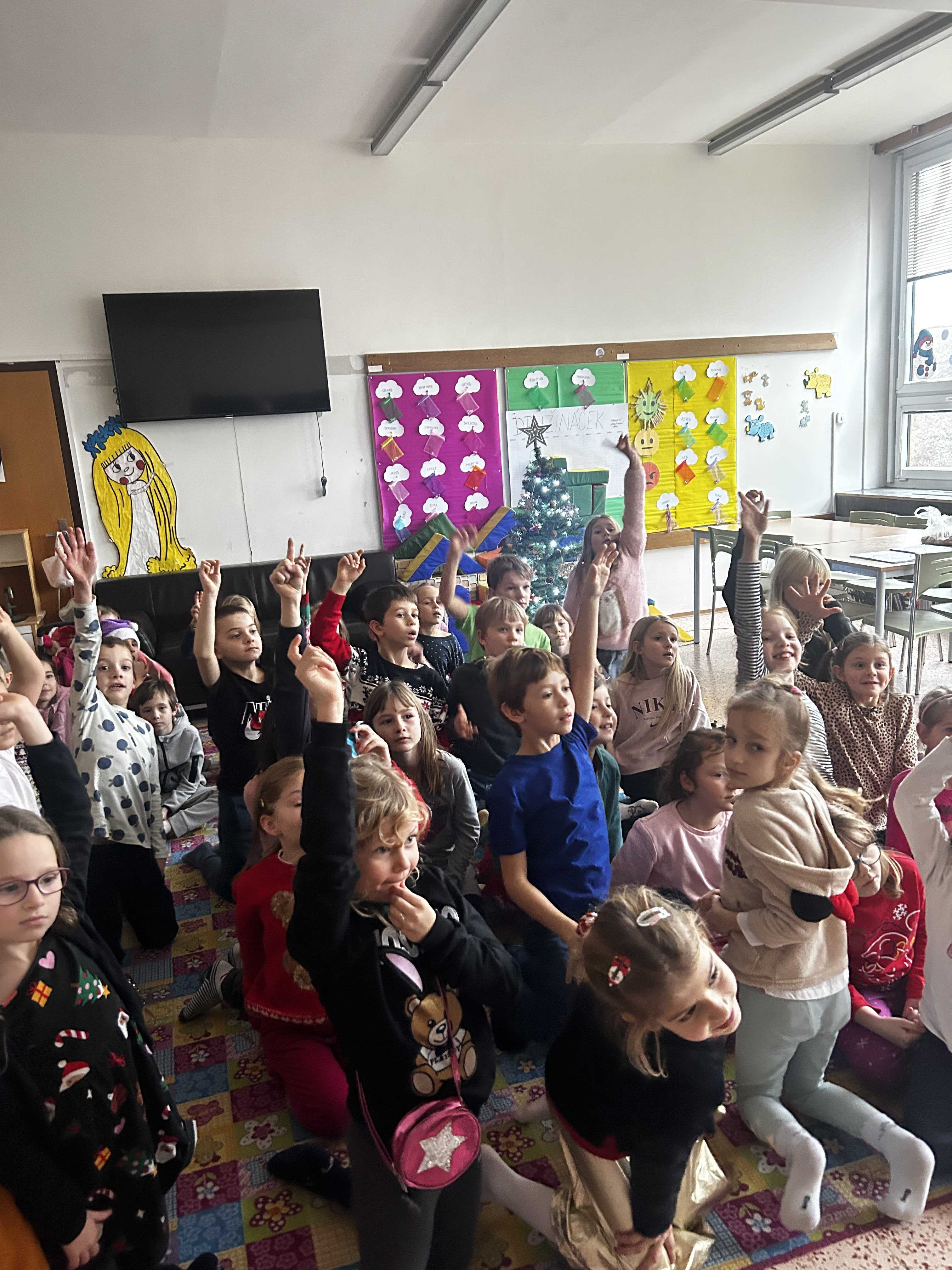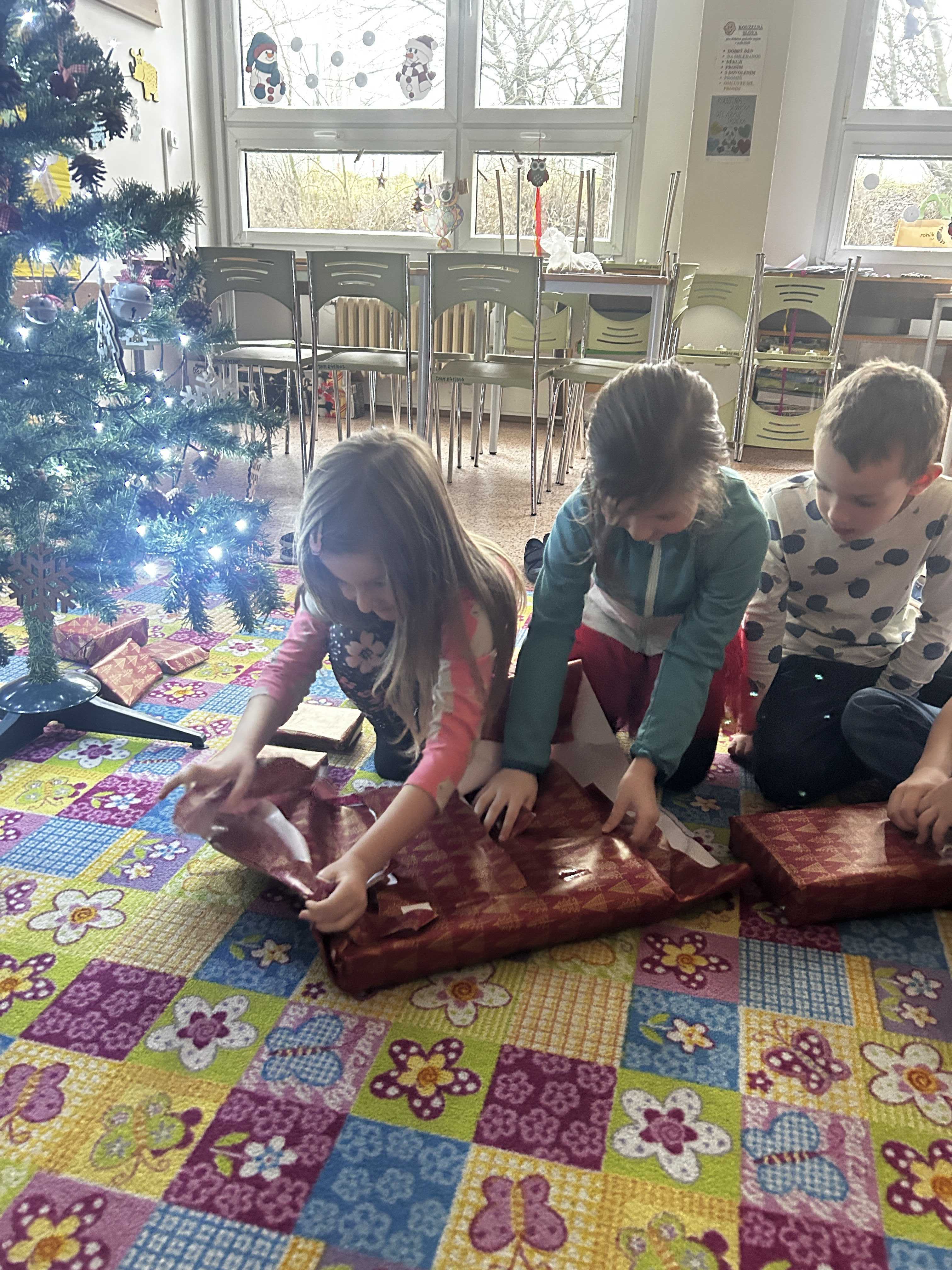 Poté se všichni vydali hledat Ježíška po škole. Na různých místech společně zpívali vánoční koledy a s napětím očekávali, kde se objeví další stopa. Nakonec přišlo to největší překvapení – v odděleních školní družiny na děti čekaly vánoční dárečky, které vykouzlily úsměvy na tvářích a radost v dětských očích.