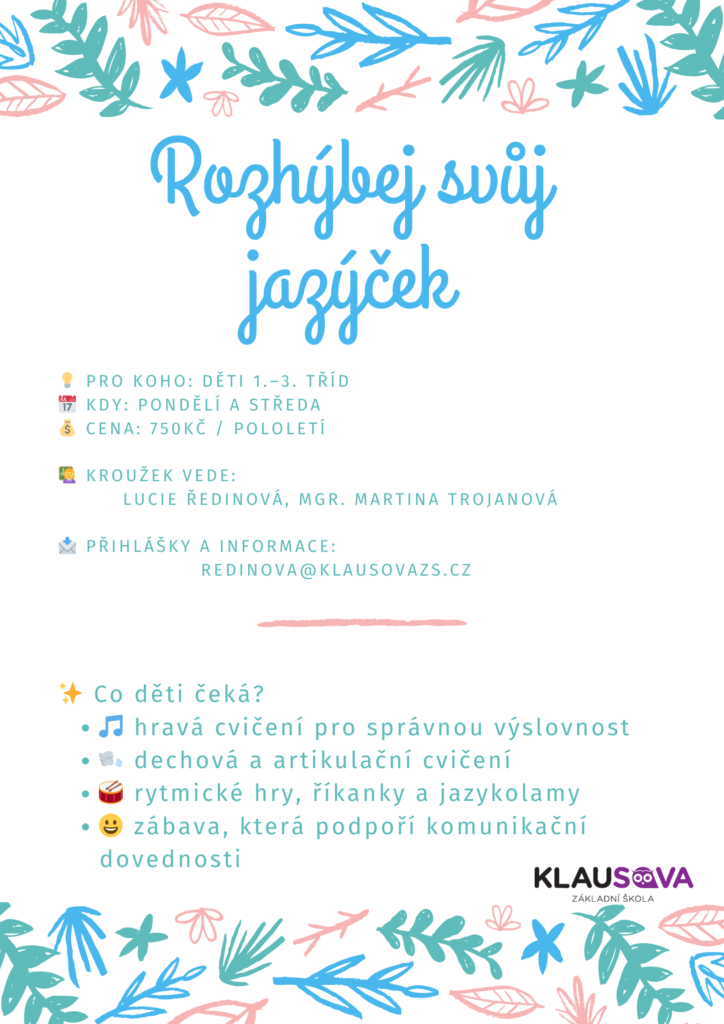 V letošním školním roce otevíráme pro děti 1.–3. tříd kroužek Rozhýbej svůj jazýček zaměřený na rozvoj správné výslovnosti a komunikačních dovedností.
